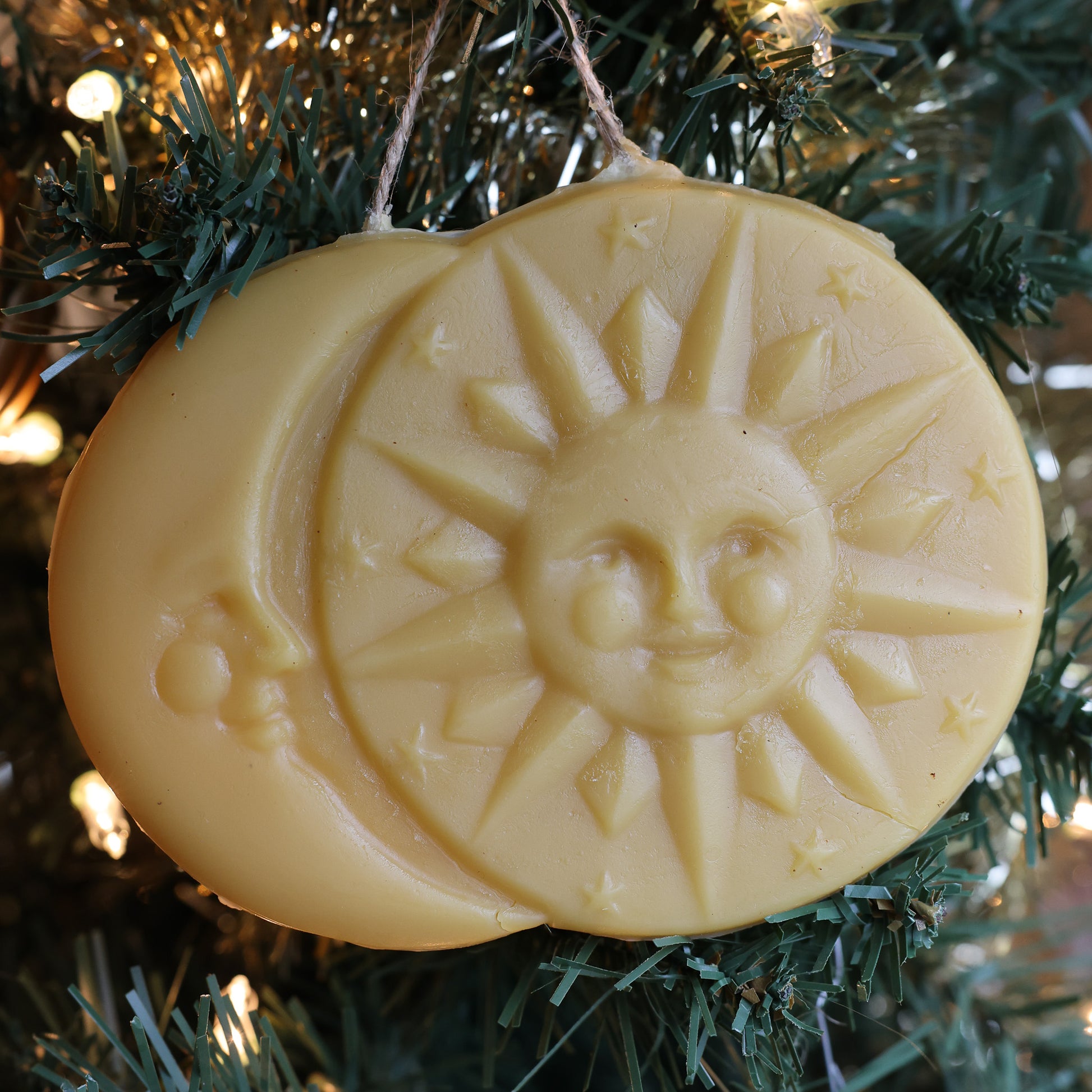 Balanced between light and night, our Sun & Moon Beeswax Ornament celebrates harmony, warmth, and wonder. Hand-poured in small batches from 100% pure beeswax gathered from our Missouri hives, it captures the smiling faces of the sun and moon surrounded by tiny stars — a reminder that light and beauty shine in every season.
